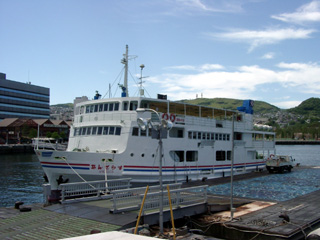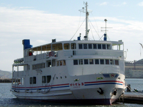 | 野母商船の客船、"あんぜらす"(総トン数:474トン、旅客定員:800名)です。1974年2月に竣工、3月より長崎~香焼航路に就航し、現在に至っています。 以下の写真は、2003年5月に長崎港にて撮影したものです。 |
