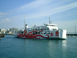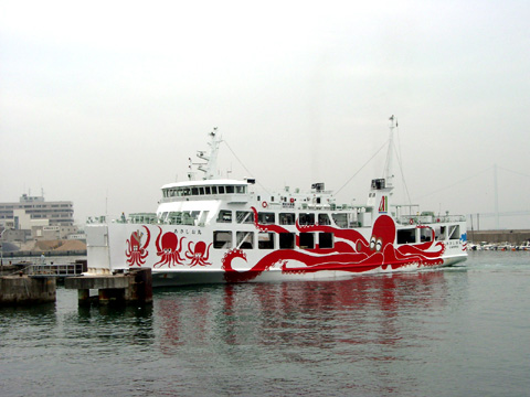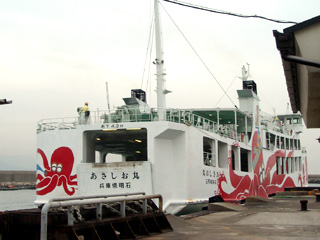 | 明石港にて接岸のため回頭中の"あさしお丸"。愛称の通り、舷側はタコで埋め尽くされています。 | |