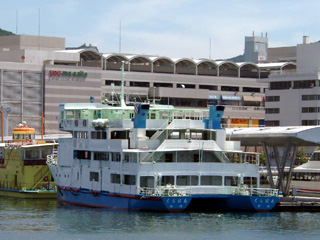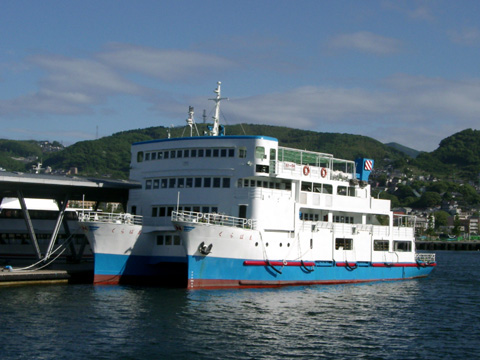 | 野母商船の客船、"ぐらばあ"(総トン数:488トン、旅客定員:800名)です。1972年10月に竣工以来、長崎~香焼航路に就航し、現在に至っています。 以下の写真は、2003年5月に長崎港にて撮影したものです。 |