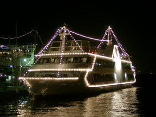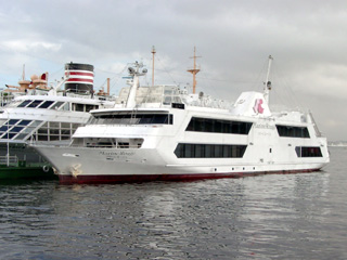 | ポートサービスのレストラン船"マリーンルージュ"(総トン数:683トン、旅客定員:364名、竣工:1992年1月)です。現在、横浜港・山下公園(氷川丸の隣)を起点にした90~120分のショートクルーズに就航しています。 以下の写真は、2002年8月および9月に撮影したものです。 |