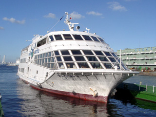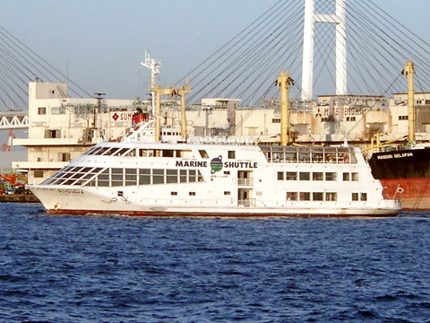 | ポートサービスの遊覧船"マリーンシャトル"(総トン数:764トン、旅客定員:596名、竣工:1985年6月)です。現在は、横浜港・山下公園(氷川丸の隣)を起点にした40~90分のショートクルーズに就航しています。2001年には船内改造済みとのことです。 以下の写真は、2002年8月および9月に撮影したものです。 |