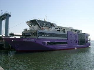 | 神戸観光汽船が運航しているレストラン船の"パルデメール"(PERLdeMER、総トン数:684トン、旅客定員:460名)です。1990年7月に竣工後、神戸港中突堤を起点としたクルーズに従事しています。数ある神戸港遊覧船の中でもその奇抜なスタイルは群を抜いており、良くも悪くもインパクトはあります。USJが開業した頃は船体にウッドペッカーを描いたりしていましたが、最近は元の紫基調の塗装に戻っています。ちなみにパルデメールとはフランス語で海の真珠という意味らしいです。 以下の写真は、2001年12月および2002年3月に撮影したものです。個人的にはあまり好きになれるデザインではありません。まだウッドペッカー塗装の方がよかったんですけどね。 |