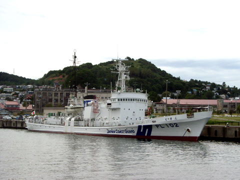 | 海上保安庁の巡視船"えさん"(PL-102)です。しれとこ型(1,000トン型)巡視船の2番船として、1978年11月に竣工し、現在は第一管区海上保安本部、小樽海上保安部に所属しています。 以下の写真は、2002年9月に小樽港にて"クリスタル・オブ・ザ・シー"の船上より撮影した物です。この"えさん"の前にはネームシップの"しれとこ"も停泊していました。 |