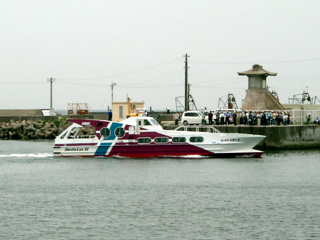 | 明淡高速船が運航する高速船"レットスター2"(竣工:2001年6月、総トン数:19トン、旅客定員:63名)です。2004年3月より僚船"レットスター1"と共に子午線ライン(明石~岩屋航路)に就航しています。所有は播淡聯絡汽船となっています。 以下の写真は、2004年5月に明石港にて撮影したものです。この時は岩屋から明石まで乗船したのですが、予想以上に揺れ、後部デッキに立っていると波しぶきがかかって大変でした。景色をじっくり楽しむならフェリー、急ぐ時(なんと所要10分)&スリルを味わう為なら小型高速船、といった感じでしょうか。 |