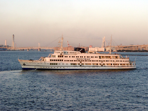 | 夕刻、ディナークルーズに出航するロイヤルウイング。国内の遊覧船の中では一番好みの船影です(塗装は別ですが)。 | |