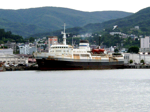 | サハリンシッピングカンパニーが運航する国際定期フェリー"サハリン7"(総トン数:9,305トン、旅客定員:36名)です。小樽~ホルムスク(ロシア・サハリン州)の定期航路(月1便)に就航しています。 以下の写真は、2002年9月に撮影したものです。撮影時は、変わった船がいるなぁ、程度の認識でしかなく、後で調べて初めて船名がわかりました。元々は鉄道連絡船だったらしいです。言われてみれば頷ける部分があります。 |