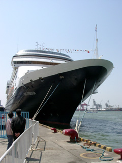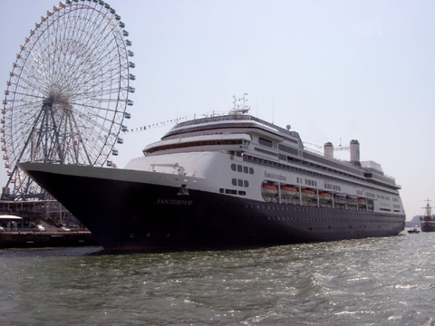 | Holland America Lineの客船、"Amsterdam"(アムステルダム、総トン数:61,000トン、旅客定員:1,380名)です。2000年に竣工後、世界一周を初めとする各種クルーズに就航しています。 以下の写真は、世界一周クルーズの途上で大阪に寄港した際(2003/4/6)に撮影したものです。 |