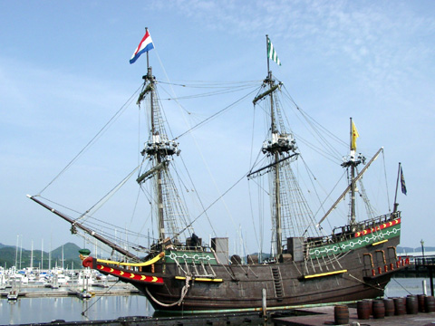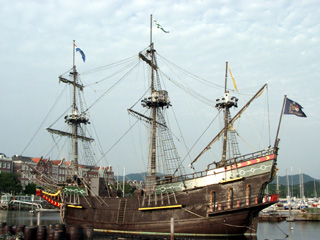 | 復元帆船"デ・リーフデ"です。オリジナルの"デ・リーフデ"はオランダの帆船で、1600年に豊後の臼杵湾に漂着して日蘭交流の発端となったことで知られています。三浦按針などもこの船で来日しています。この復元船は、長崎のハウステンボスにて展示されています。 以下の写真は、2003年7月にハウステンボスを訪れた際に撮影したものです。残念ながら船内見学が出来るようにはなっていませんでした。 |
