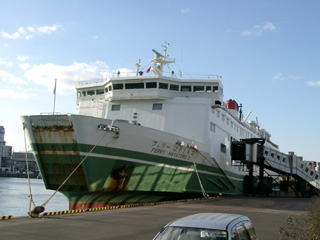 | 関西汽船のカーフェリー"フェリーはやとも2"(総トン数:4,234トン、乗客定員:756名)です。1987年に竣工後、僚船の"フェリーくるしま"と共に松山~小倉航路に就航、現在も活躍中です。 以下の写真は、2002年2月に小倉港にて撮影したものです。変な時間帯に訪れた為かと思いますが、閑散として寂しい雰囲気でした。 |