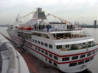 客船ターミナルより撮影。ちょっと見づらいですが、煙突には確かに往年のGerman Atlantic Lineのロゴが入っています。 |
