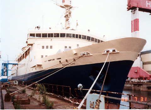 | 元青函連絡船の"摩周丸"(2代目)です(総トン数:8,328トン、乗客定員:1200名)。1965年6月に"津軽丸"型の5番船として竣工し、1988年3月の青函トンネル開通に伴い引退するまでの間、青森~函館間の青函連絡航路にて活躍しました。1991年より函館シーポートプラザにて記念保存船として一般に公開されています。 以下の写真は、引退直後の1988年7月に、函館港にて撮影したものです。当時開催中の青函博におけるパビリオンの一つとして利用されていたように記憶しています。 |
