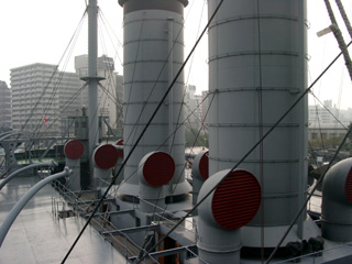 艦橋より艦中央部を撮影。高い煙突と大きなベンチレーターが印象的です。 |