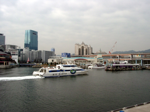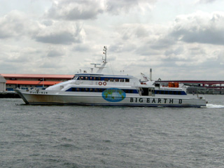 | 神戸港中突堤における"びっぐあーす"。2001/2/4撮影。この頃は地球の絵や船体横の大きな船名などは入っていませんでした。窓の部分の青いラインは新幹線のイメージでしょうか。速いから? | |