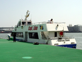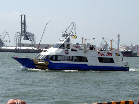 | タラッサ(キャプテンライン)が運航している"キャプテン・シルバー"(総トン数:60トン、乗客定員:146名)です。元は早駒運輸の"ロマン1"(もしくは"ロマン2")で、2001年3月より僚船の"キャプテン・クック"と共に天保山(海遊館西はとば)~ユニバーサルシティーポート間に就航しています。なお、最近は大阪南港~USJ航路(ドリームシャトル)にも就航しているようです。 以下の写真は、2003年春に"アムステルダム"を見るために天保山を訪れた際に撮影したものです。休日ということもあってか、頻発しているにも関わらず船上には乗客の姿が絶えませんでした。 |