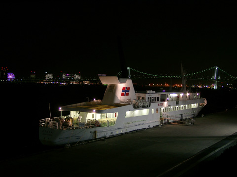 竹芝桟橋にて停泊中の"はまゆう丸"。竹下桟橋は、バックにレインボーブリッジやらお台場やらが見えて結構絵になります。(2002年10月撮影)