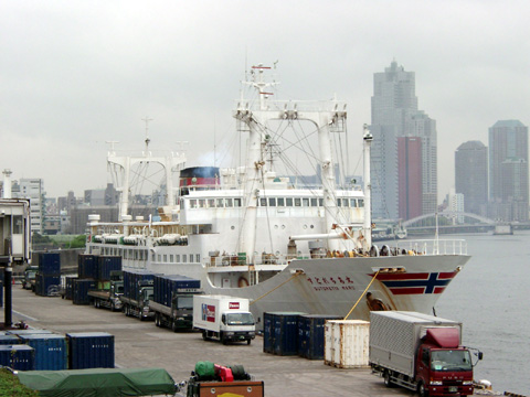 | 竹芝桟橋にて停泊中の"すとれちあ丸"。大型のデリックが目立って見えます。東海汽船の大型船で、ここまで貨客船らしいものは、"すとれちあ丸"が初めてだったような気がします。こうコンテナに囲まれていると、さらに貨客船らしさが増すような感じがします。 |